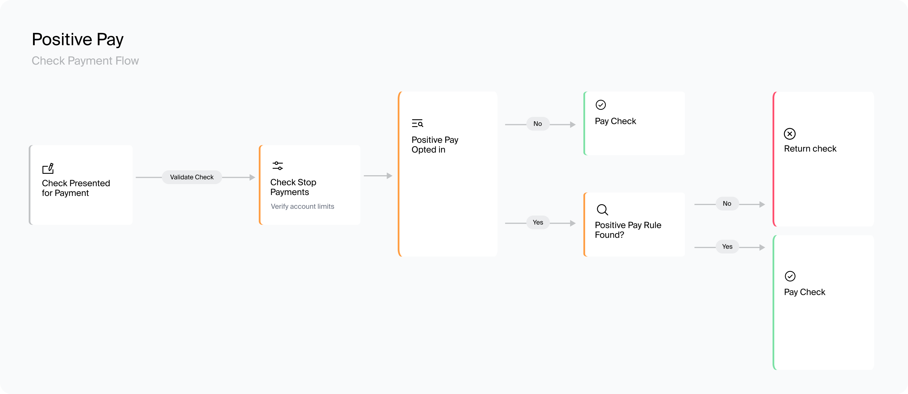 Positive Pay is commonly applied to check flows, where the risk of forged, altered, or duplicate checks is highest. It often works in conjunction with Stop Payments, which block specific known checks, while Positive Pay validates incoming checks against a broader set of expected payment details. Together, they create layered defense before settlement.