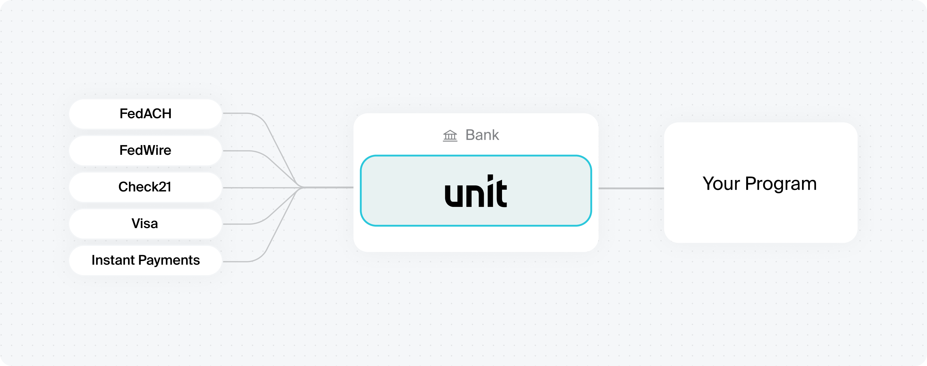 Unit is a registered service provider with the Federal Reserve. Payments flow from our infrastructure directly to Federal Reserve systems, on behalf of our partner banks.